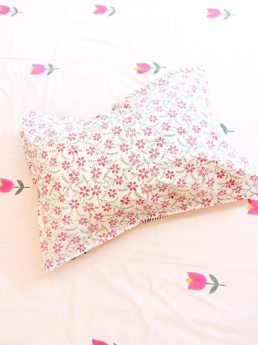 Begum Pink Tulip Block Printed Bedsheet with Two Reversible Pillow Covers