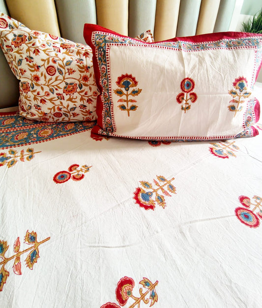 Begum Lotus Bunch Block Printed Bedsheet with Two Reversible Pillow Covers