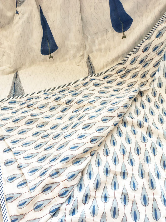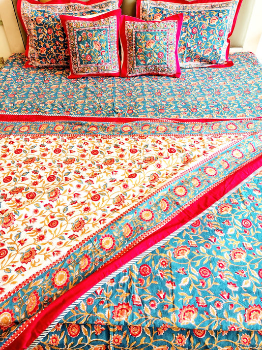 Begum Blue Floral Block Print Bedsheet and Bedcover - 4 Piece Combo