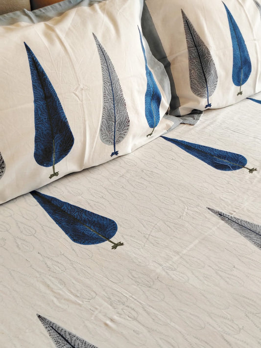 Begum Blue Pine Block Printed Bedsheet with Two Reversible Pillow Covers
