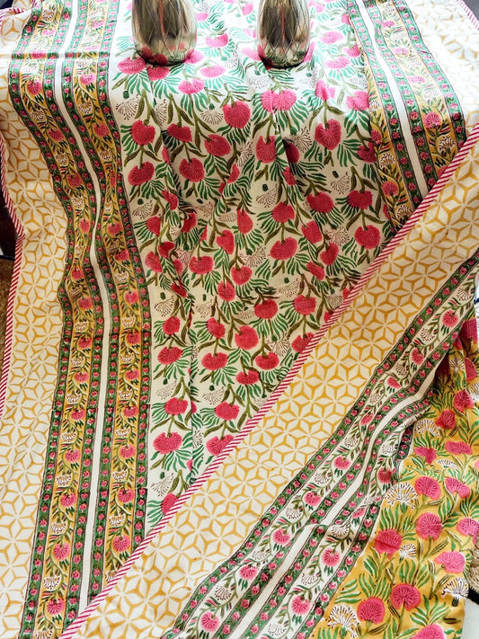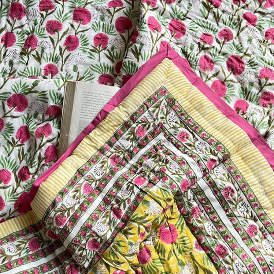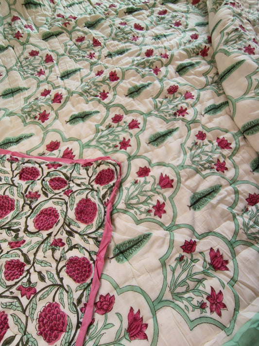 Pink Blossom Hand Block Reversible Double Bed Quilt