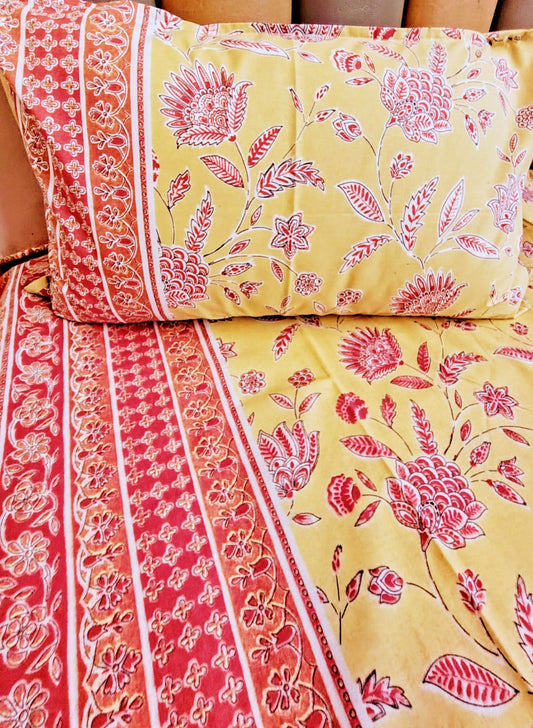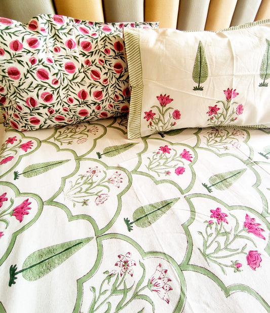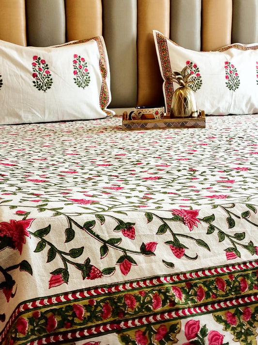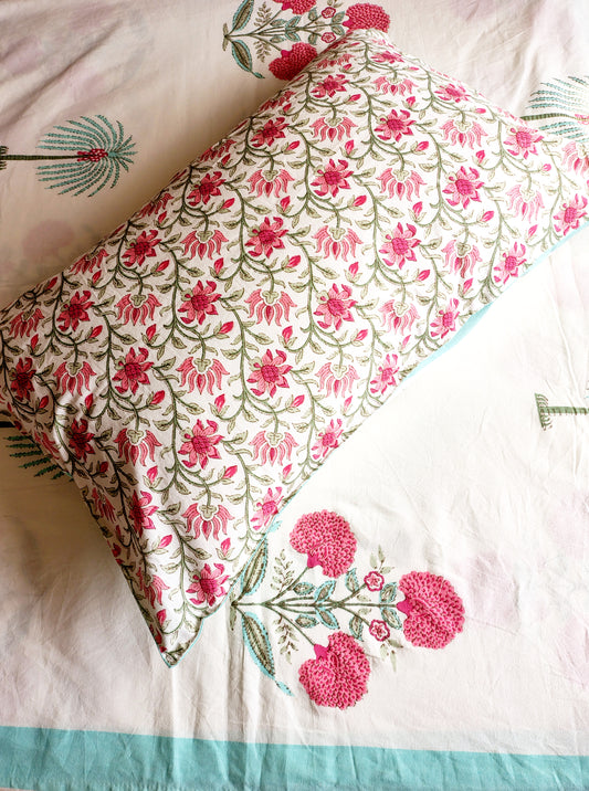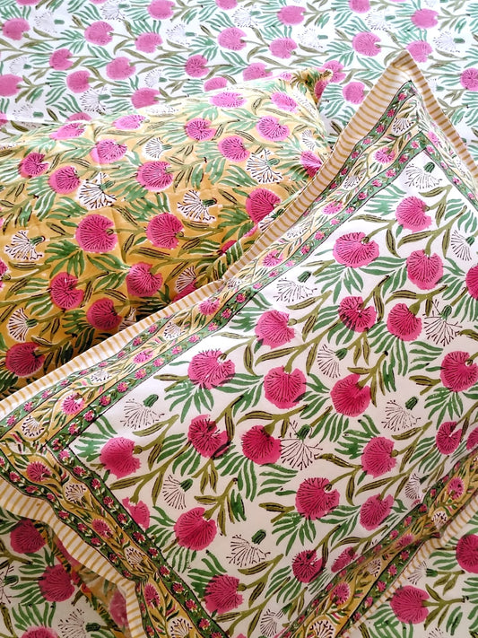 Pink Blossom Block Printed Bedsheet with Two Reversible Pillow Covers