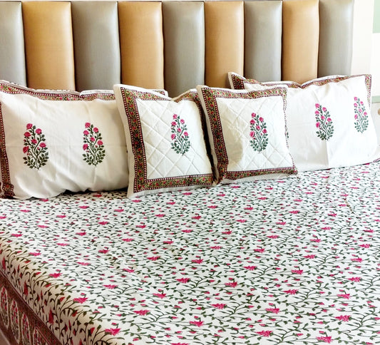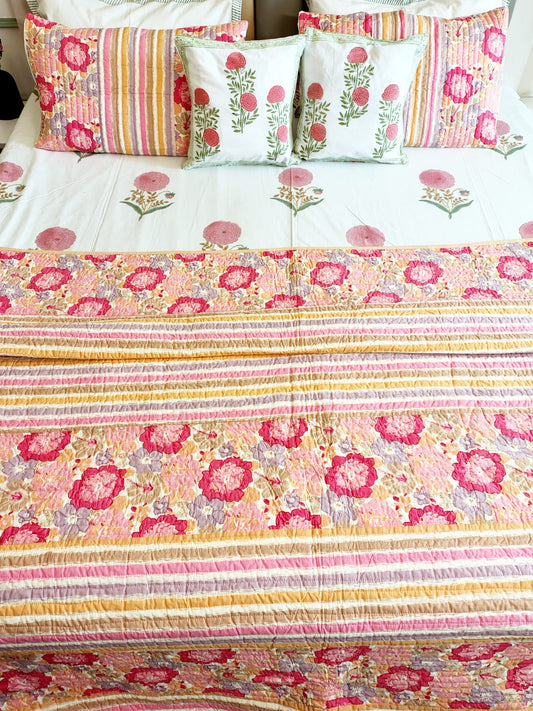 Pink Blossom Block Print Bedsheet & Quilt Set