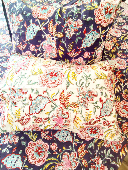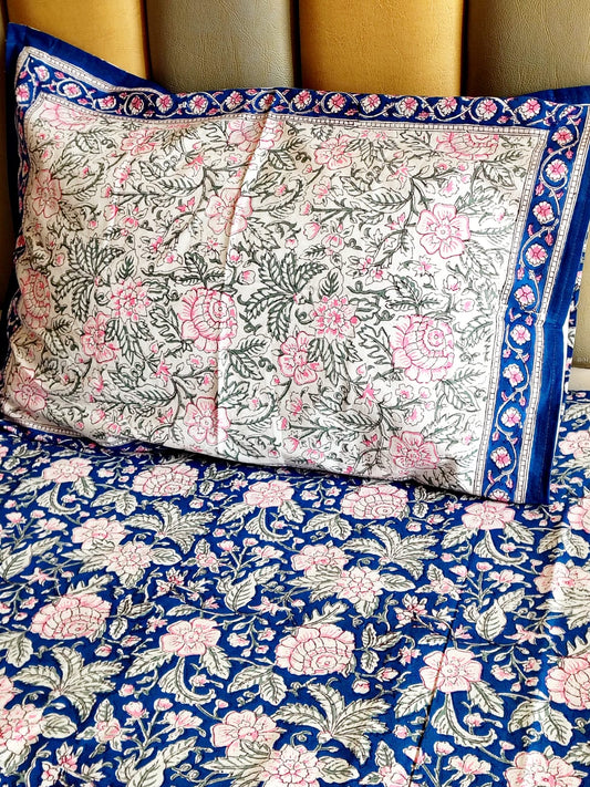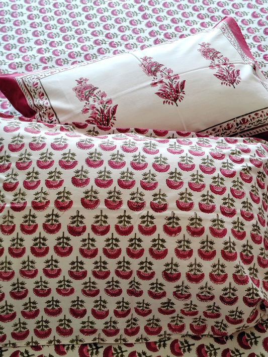 Pinky Pom Block Printed Bedsheet with Two Reversible Pillow Covers