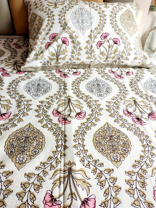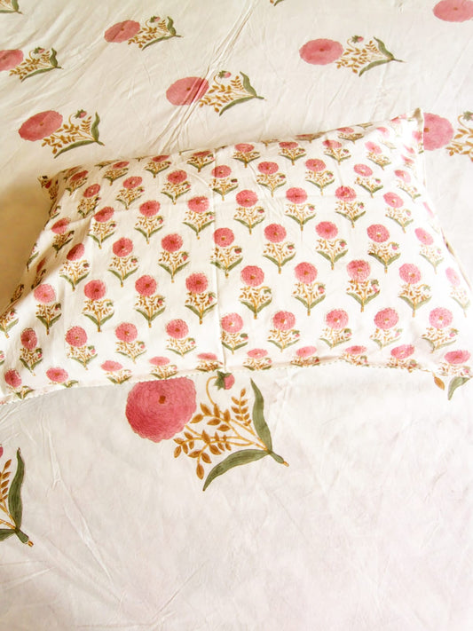 Pink Marie Block Printed Bedsheet with Two Reversible Pillow Covers