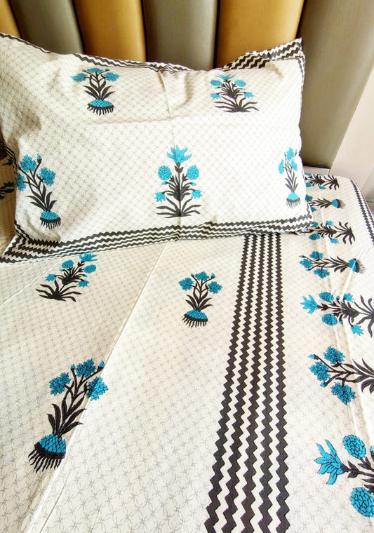 Blue Floral Jaal Block Printed Bedsheet with Two Reversible Pillow Covers