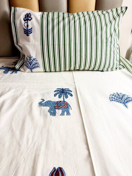 Blue Elephant Traditional Printed Bedsheet with Two Reversible Pillow Covers