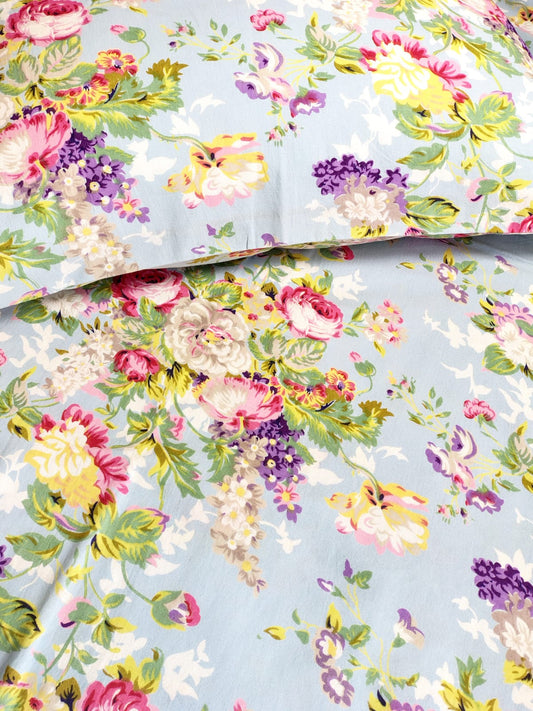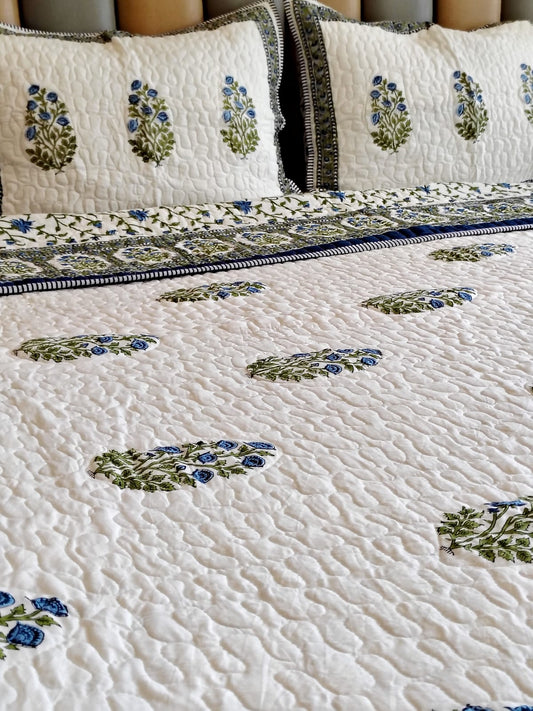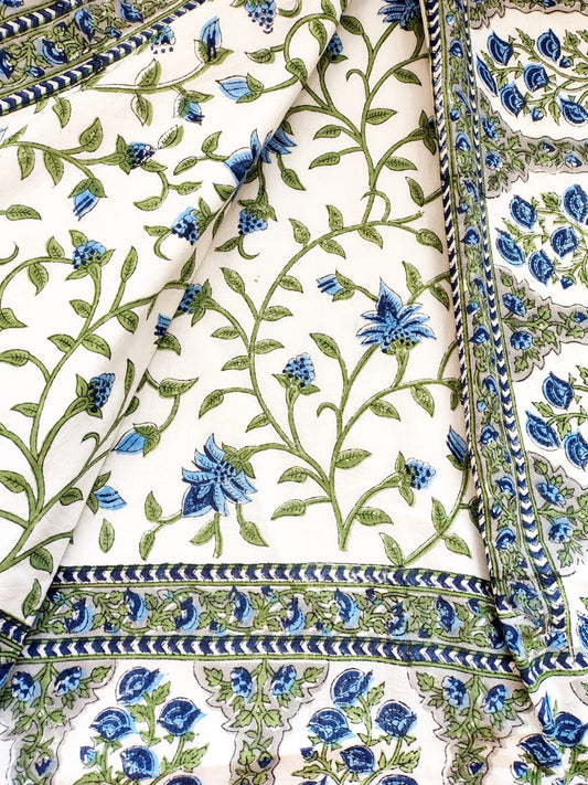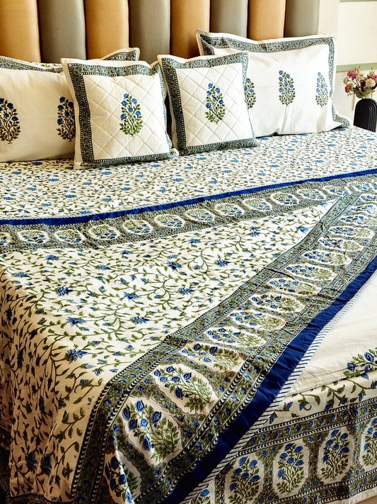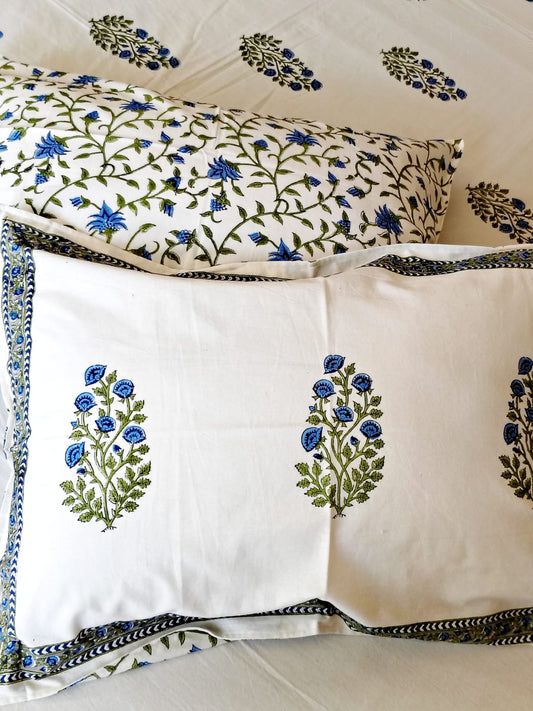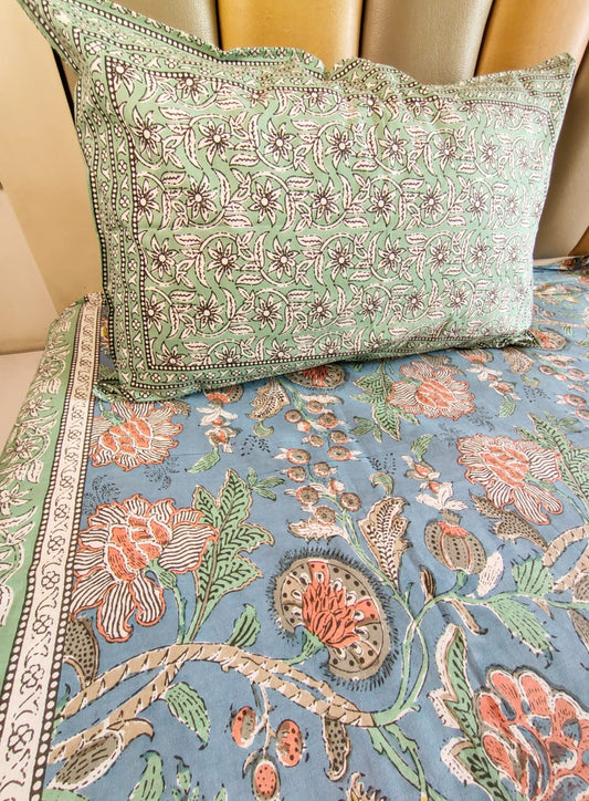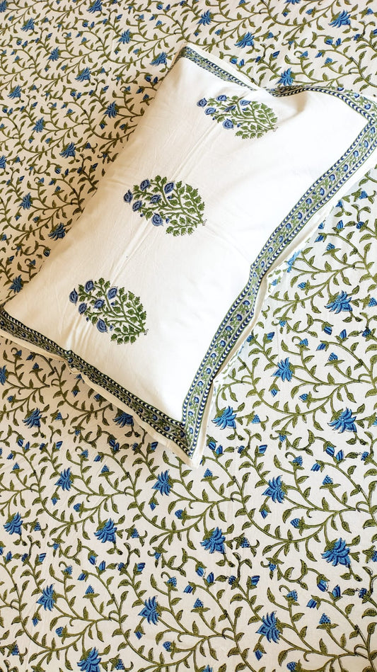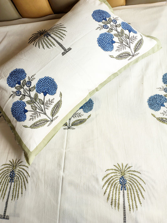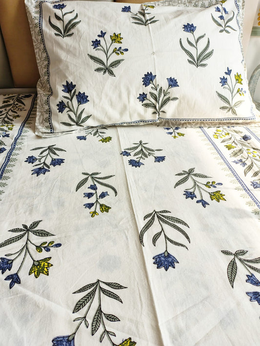 Blue Floral Bunch Block Printed Bedsheet with Two Reversible Pillow Covers