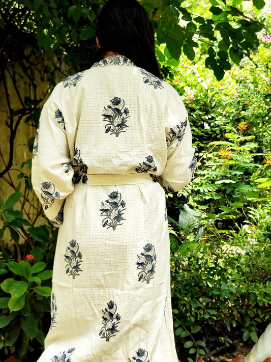 Blue Floral Jaal Printed Cotton Waffle Handblock Bathrobe