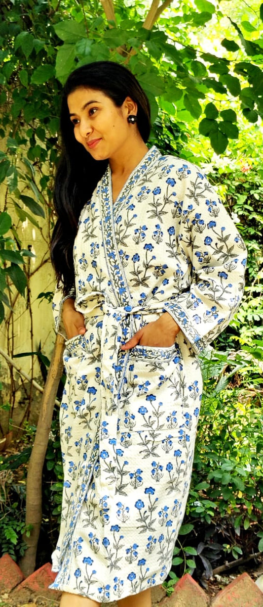 Blue Bunch Floral Printed Cotton Waffle Handblock Bathrobe