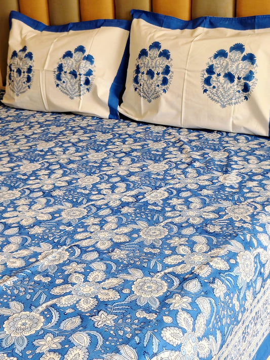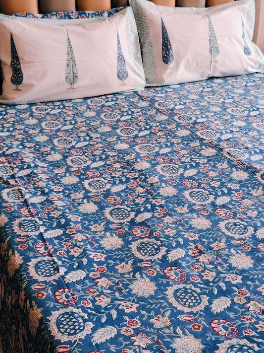 Blue Floral Block Printed Bedsheet with Two Reversible Pillow Covers