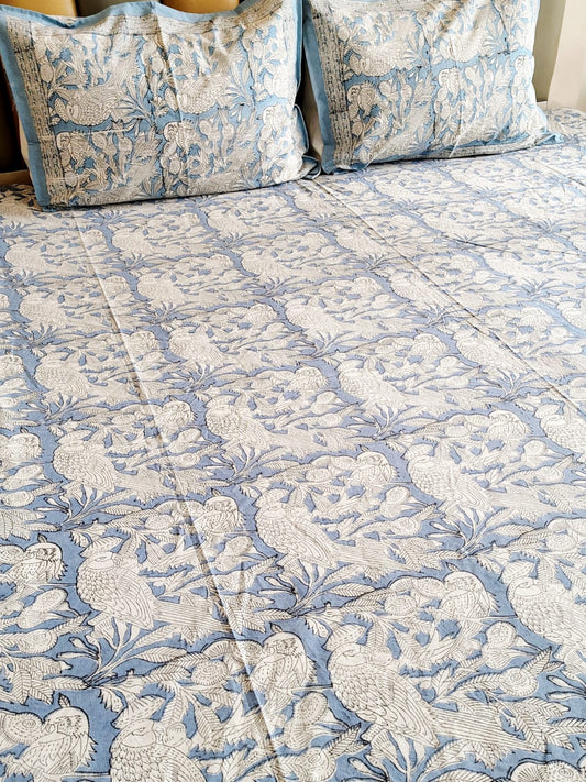 Parrot Block Printed Bedsheet with Two Reversible Pillow Covers