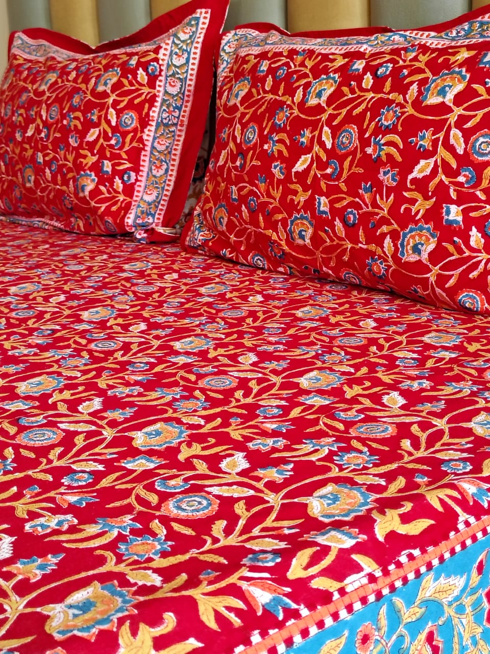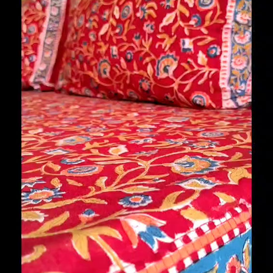 Begum Red Floral Block Printed Bedsheet with Two Reversible Pillow Covers