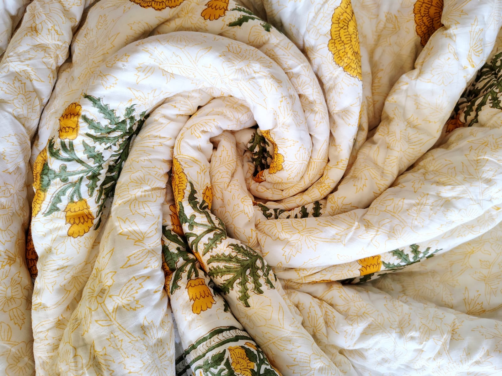Yellow Genda Hand Block Reversible Double Bed Quilt