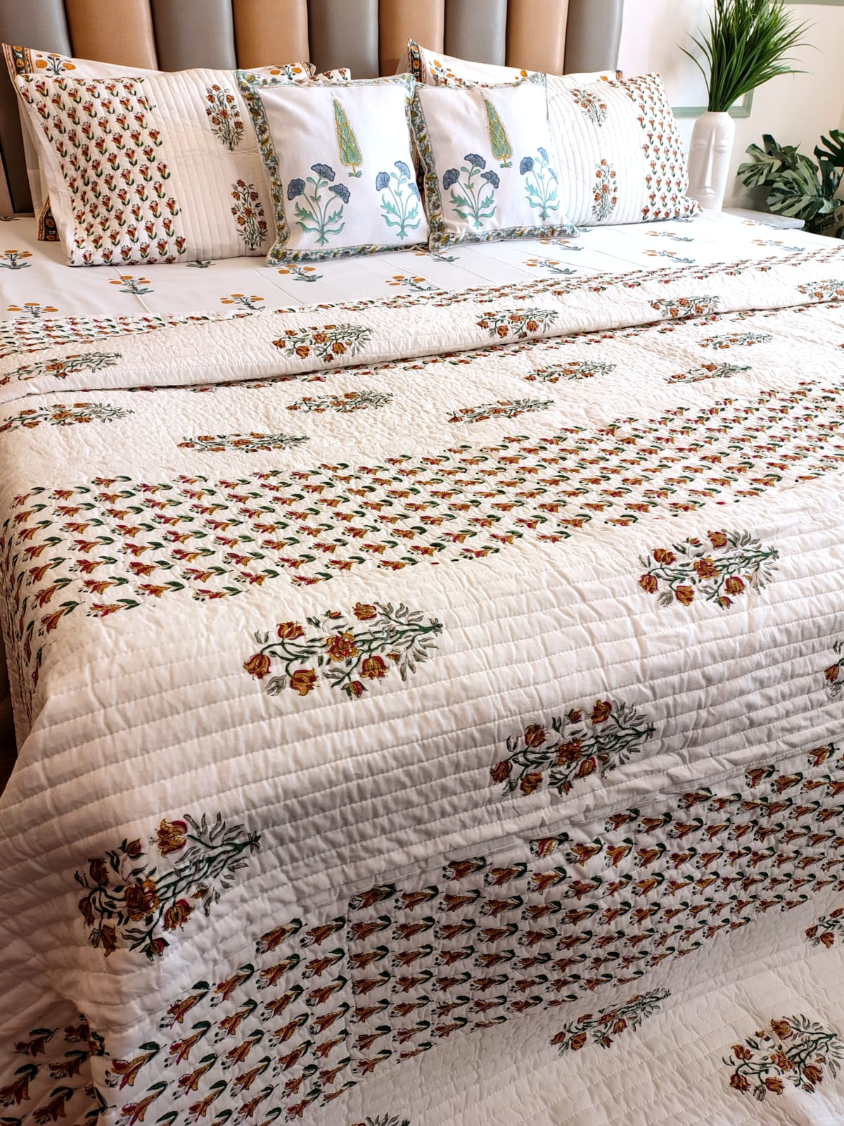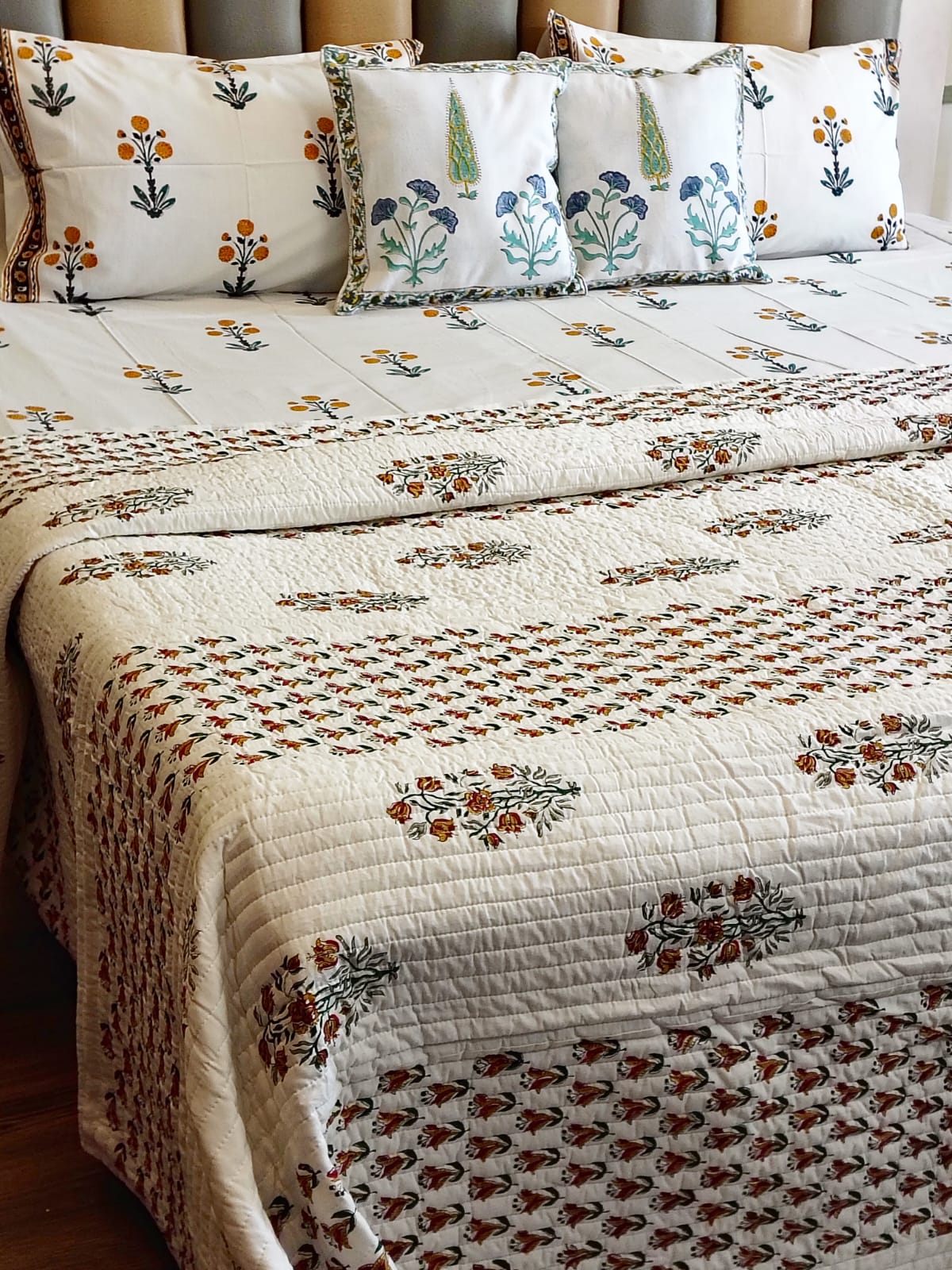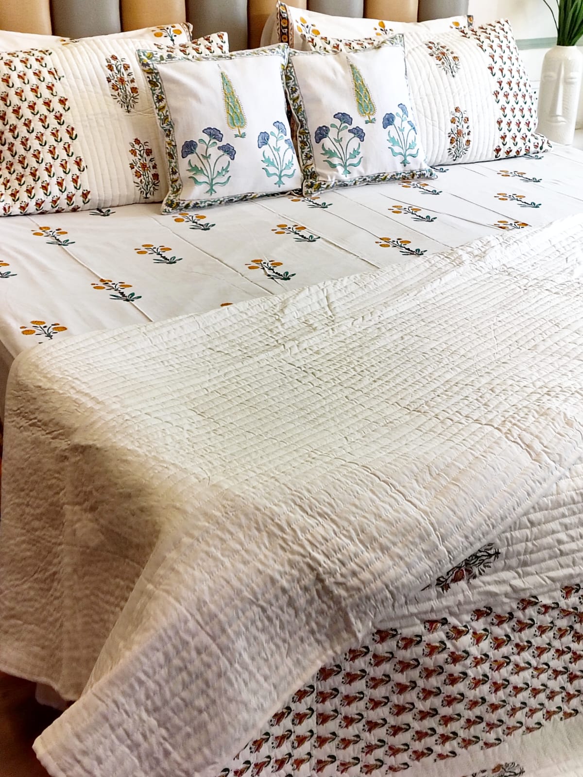 Experience the artistry of Rajasthan with our Hand Block Printed Cotton Bedsheet, complete with matching pillow covers and a Hand Block Printed Cotton Bedcover and two Cushion Covers. This collection showcases traditional craftsmanship with a contemporary touch.