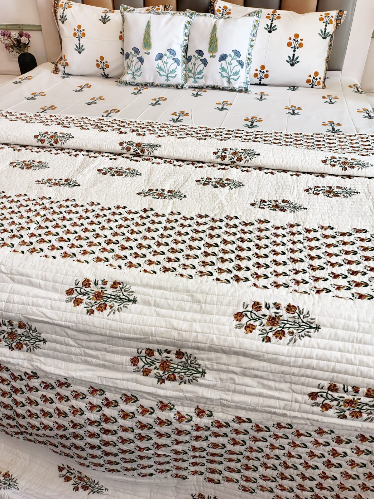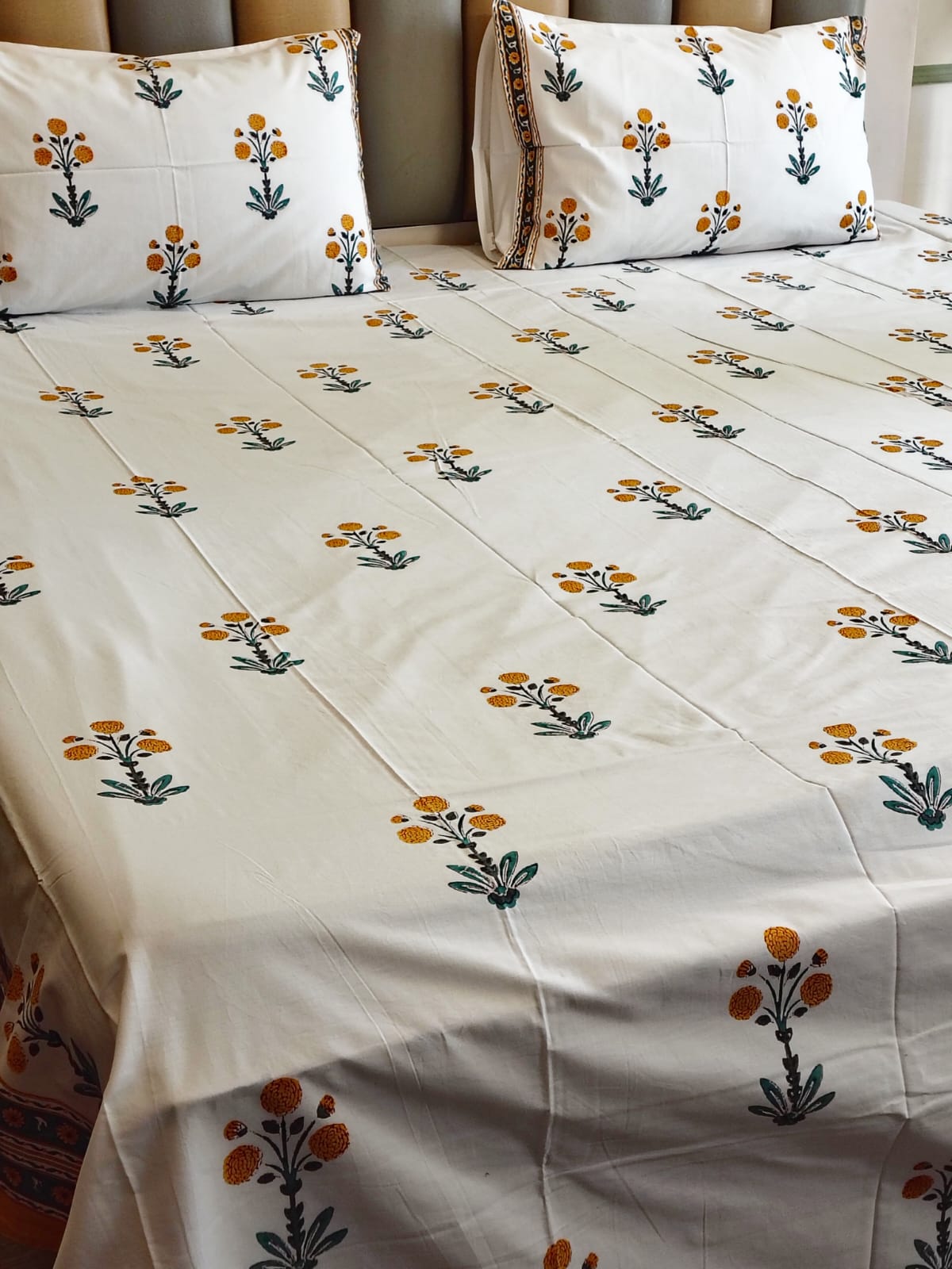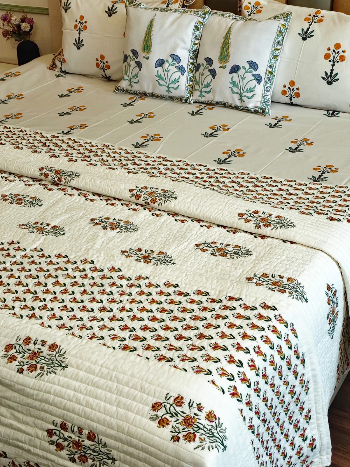 Experience the artistry of Rajasthan with our Hand Block Printed Cotton Bedsheet, complete with matching pillow covers and a Hand Block Printed Cotton Bedcover and two Cushion Covers. This collection showcases traditional craftsmanship with a contemporary touch.