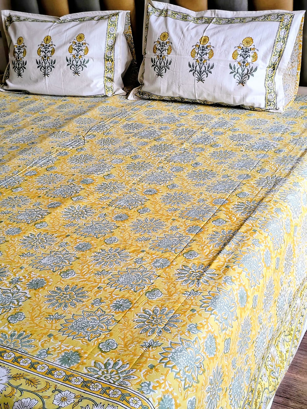 Lemon Floral Hand Blocked Double Bedsheet with Two Reversible Pillow Cove