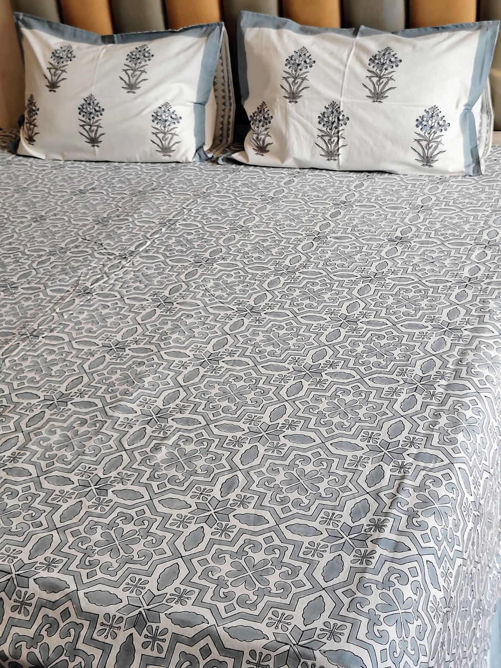 Grey Geometry Hand Blocked Double Bedsheet with Two Reversible Pillow