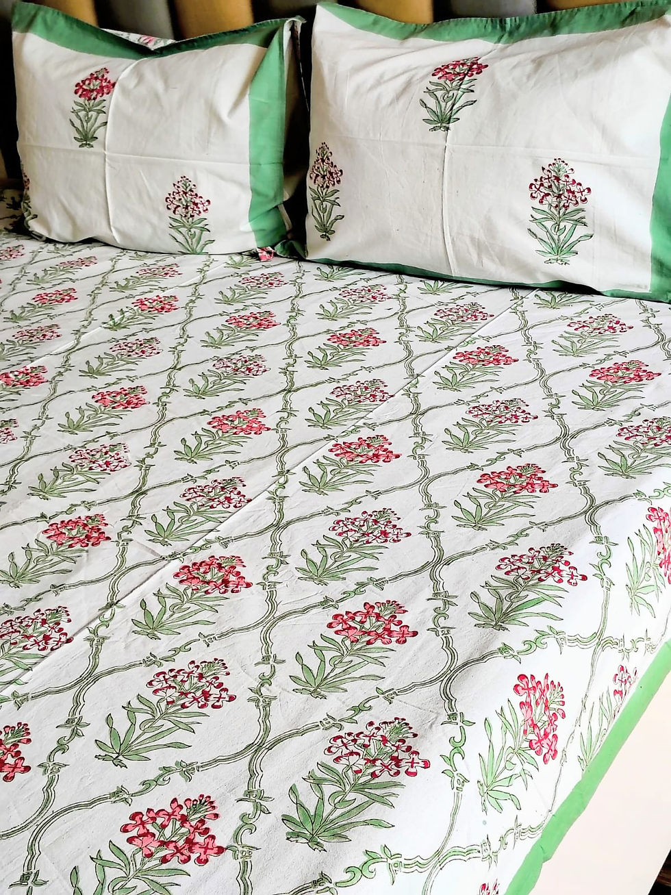 Paan Floral Hand Blocked Double Bedsheet with Two Reversible Pillow Cove