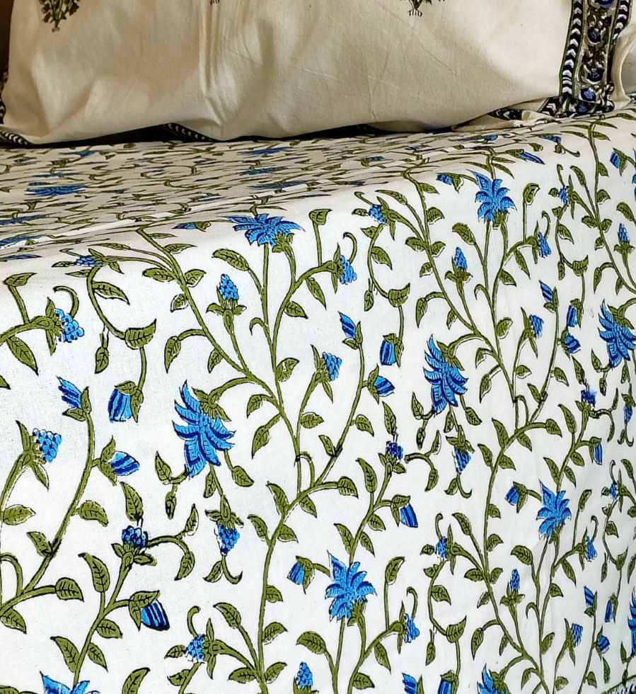 Blue Floral Jaal Hand Blocked Double Bedsheet with Two Reversible Pillow Co