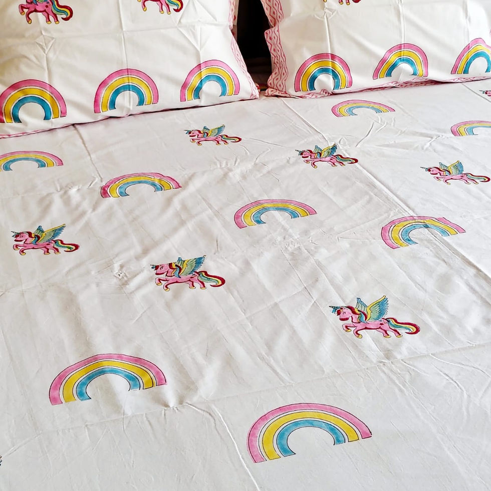Unicorn Hand Blocked Double Bedsheet with Two Reversible Pillow Co