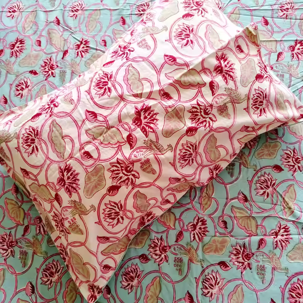 Blockprint Double Bedsheet with two reversible pillow covers, handcrafted in soft, breathable cotton. Made by artisans of Rajasthan using azo-free dyes, it offers everyday comfort with timeless elegance.