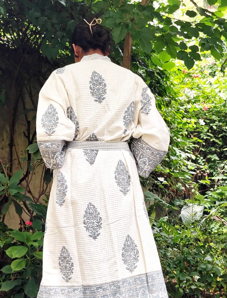 Grey Block Printed Waffle Cotton Bathrobe