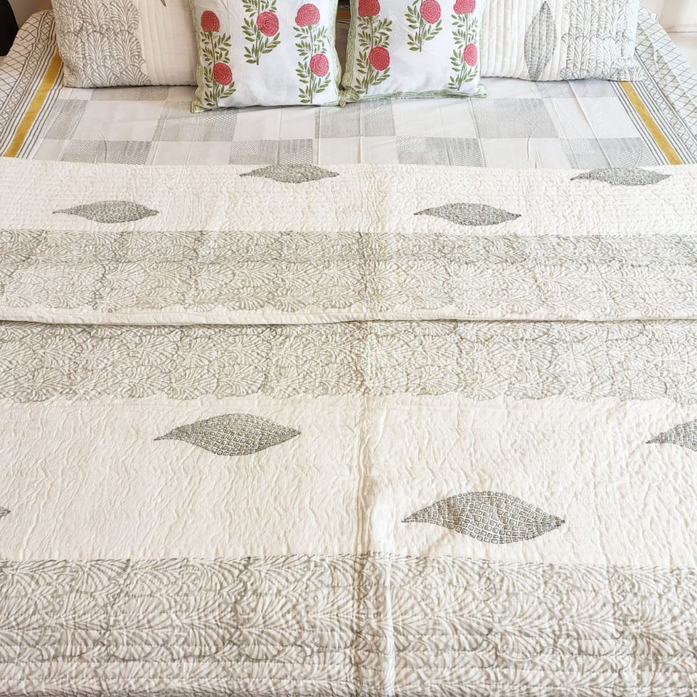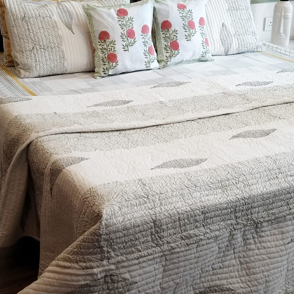 A handcrafted quilted bedcover made from soft cotton muslin and filled with 100% surgical cotton. Hand block-printed and lightly quilted, it offers breathable comfort and timeless Indian craftsmanship for everyday elegance.