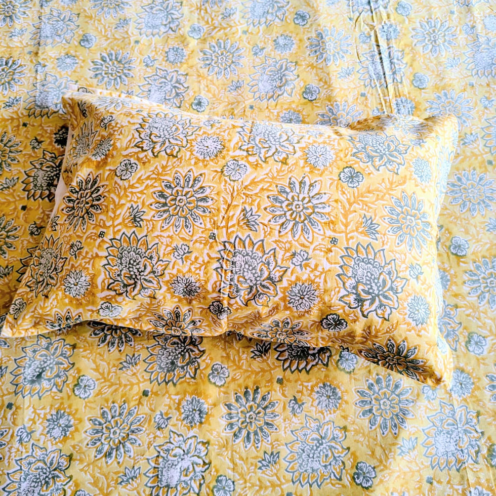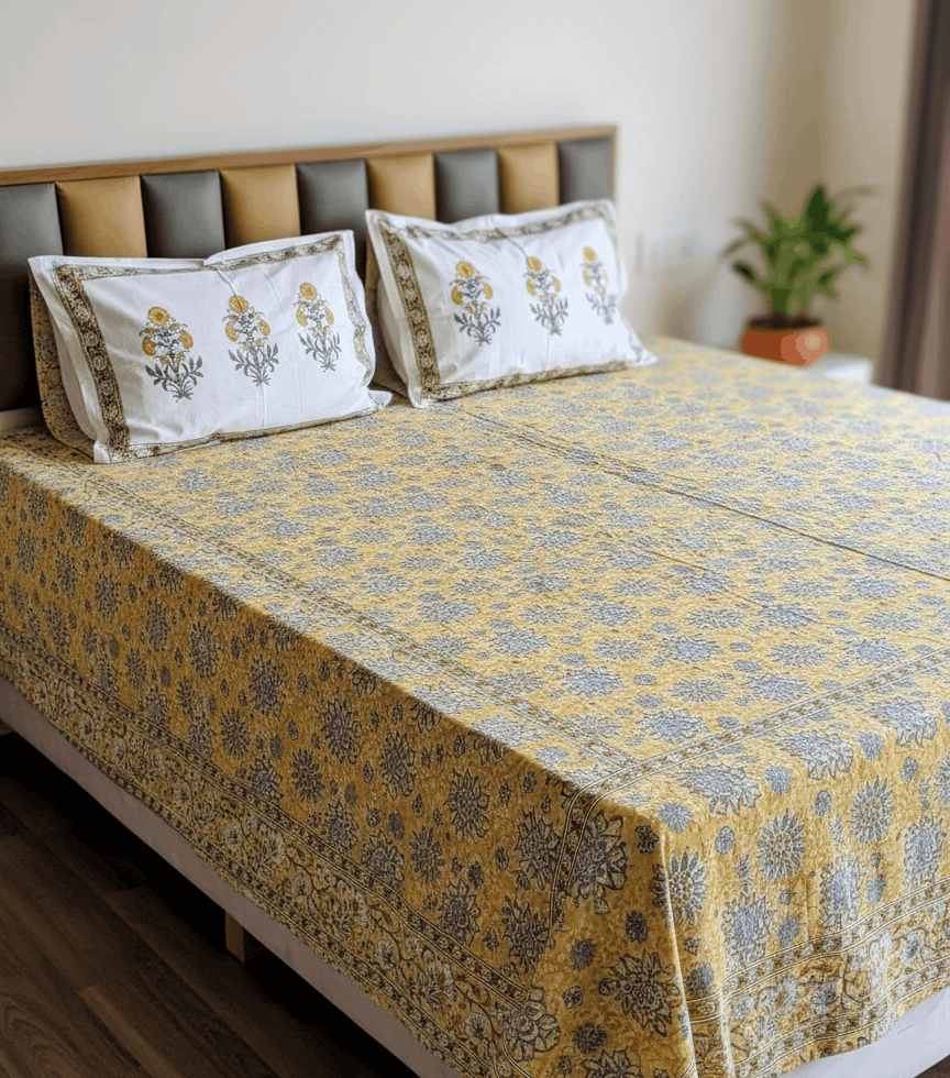 Lemon Floral Hand Blocked Double Bedsheet with Two Reversible Pillow Cove