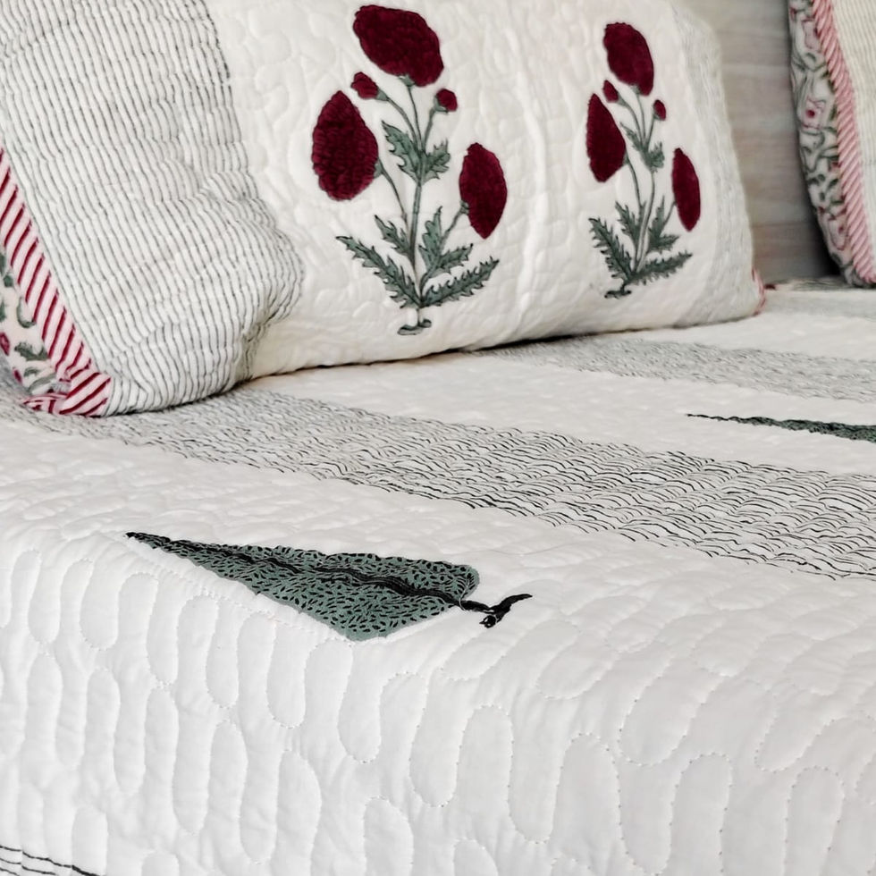 A handcrafted quilted bedcover made from soft cotton muslin and filled with 100% surgical cotton. Hand block-printed and lightly quilted, it offers breathable comfort and timeless Indian craftsmanship for everyday elegance.