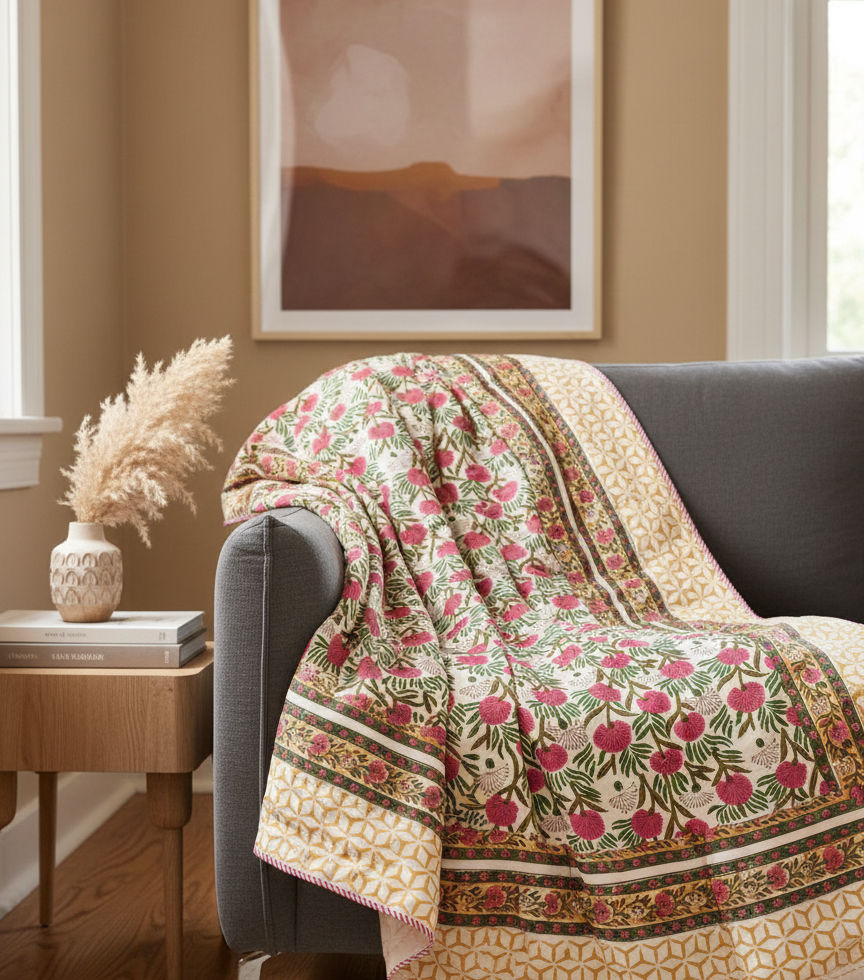 Crafted from three layers of soft cotton mulmul, our hand block printed dohar offers gentle warmth and everyday comfort. Light, breathable, and finished with subtle piping, it’s the perfect layer for mild winters and air-conditioned rooms.