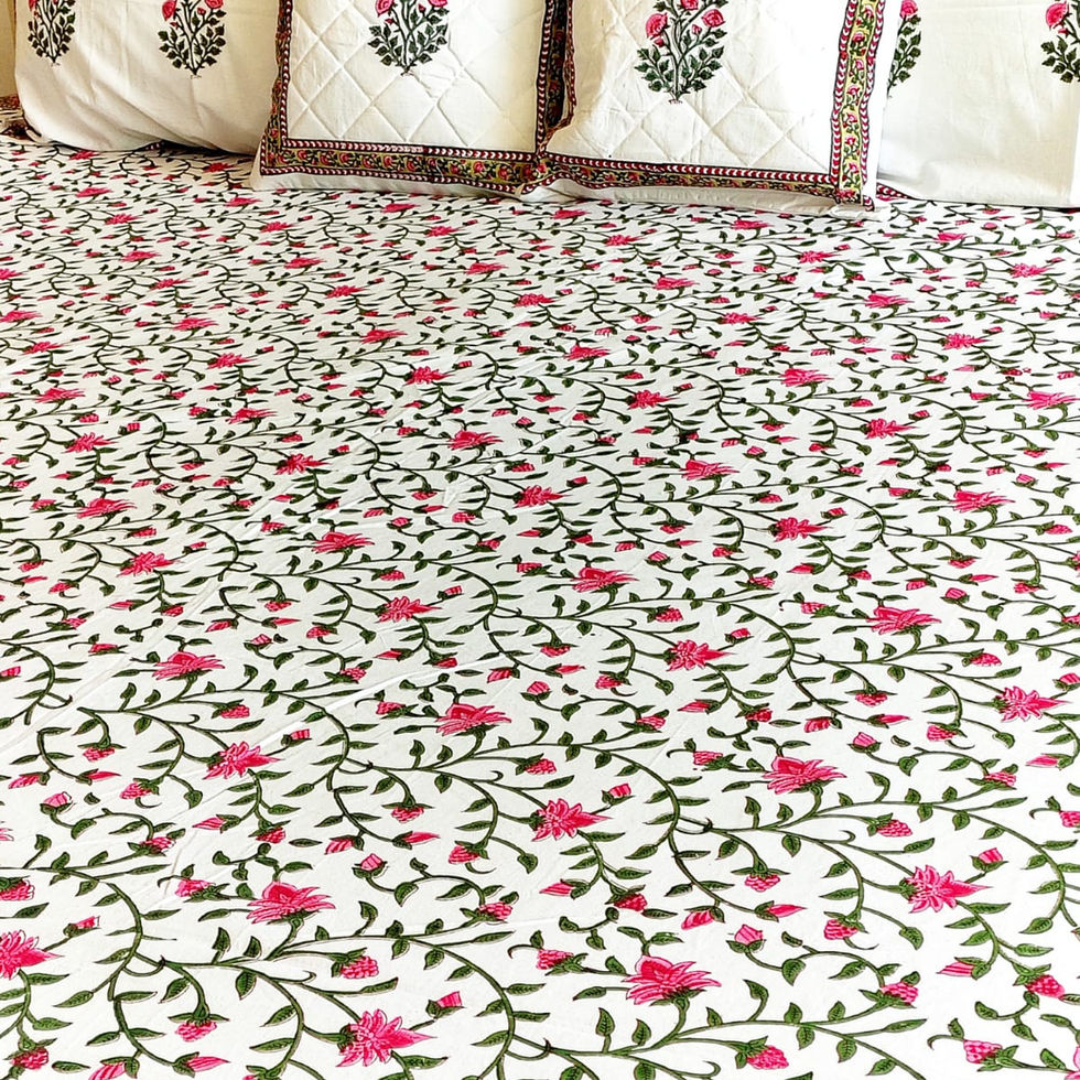 Pink Floral Jaal Hand Blocked Double Bedsheet with Two Reversible Pillow Covers