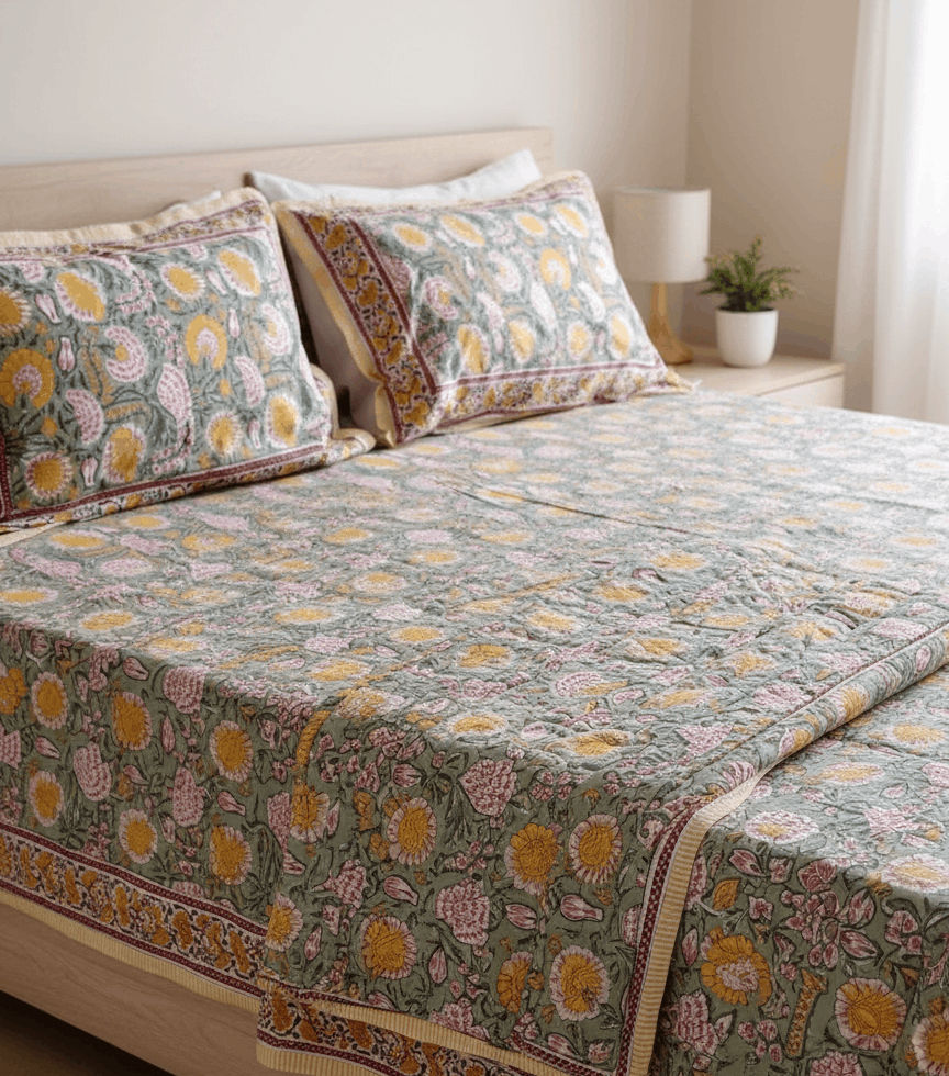 Yellow Marie Hand Block Print Bedsheet & Quilt Set