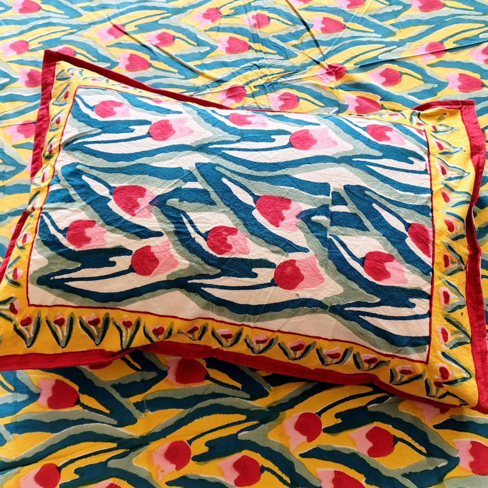 Yellow Tulip Hand Blocked Double Bedsheet with Two Reversible Pillow Cover