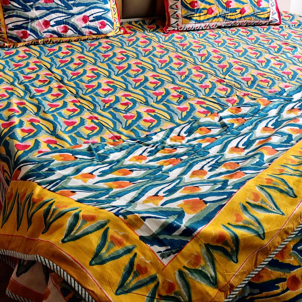 Yellow Tulip Hand Block Print Bedsheet and Dohar Set